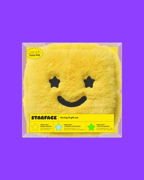 ¡El gran set de regalo Lil está de vuelta y más suave que nunca! Tu set de regalo de edición limitada favorito ahora viene con una bolsa peluda con cierre llena de 48 protectores de granos Hydro-Star hechos para ayudar a absorber el líquido y reducir los granos. En el interior encontrarás tres mini paquetes de parches Hydro-Star: Hydro-Star clásico , Hydro-Star + ácido salicílico e Hydro-Star + árbol de té .