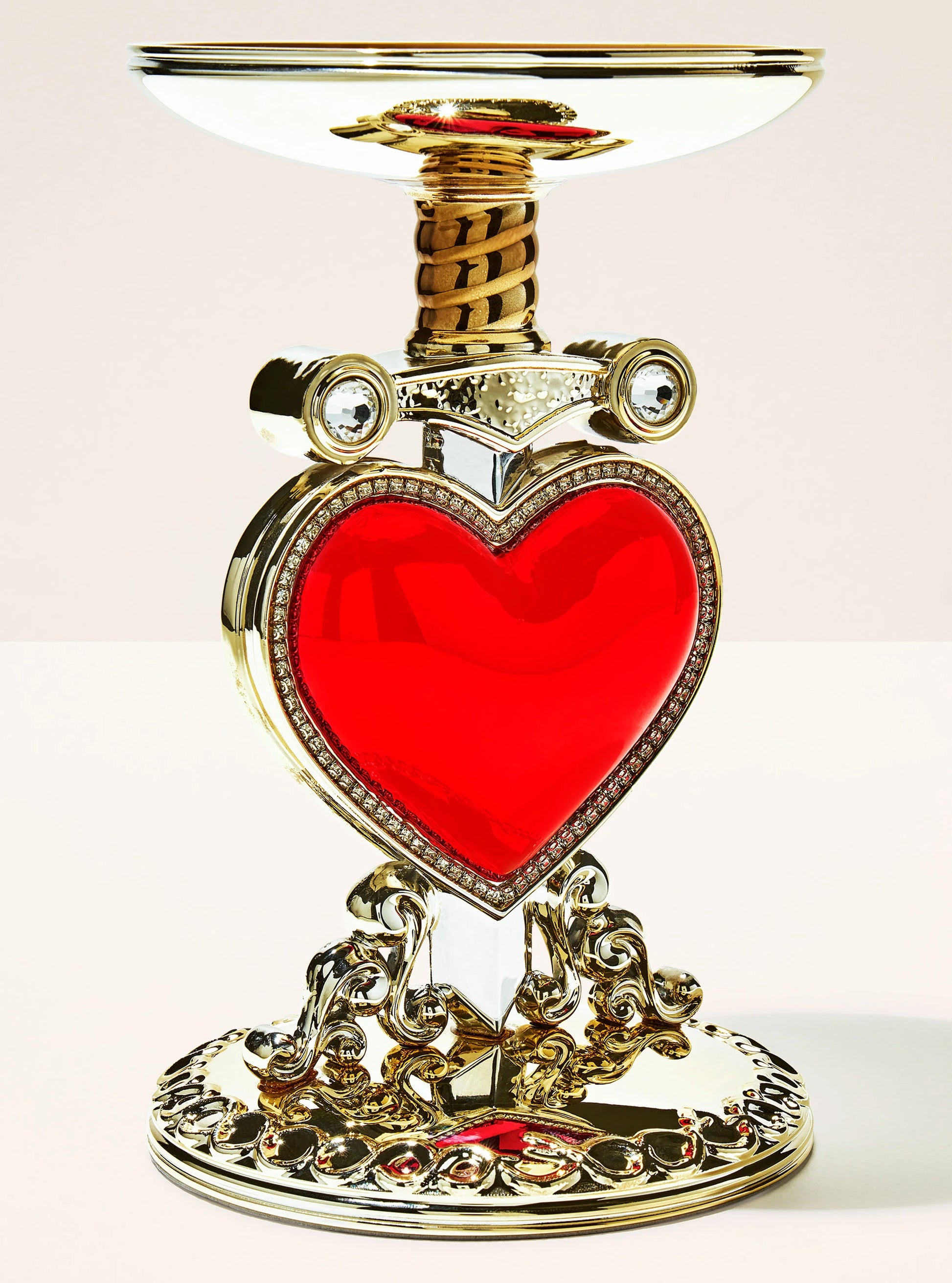 La mejor manera de poner tu época de villano en un pedestal: este candelabro encarna el encanto envidioso de la mismísima Reina Malvada. Forjado para sostener tu vela favorita de tres mechas, su brillante corazón rojo seduce incluso al alma más pura.